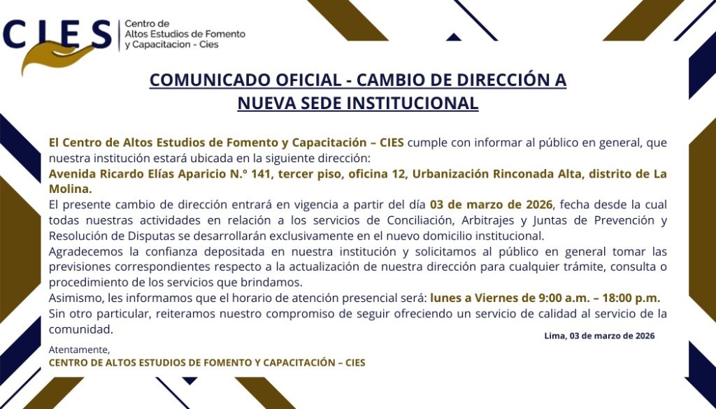 Aportamos soluciones jurídicas Nuestros servicios ARBITRAJE CAPACITACIÓN CONCILIACIÓN PROYECTOS DE INVERSIÓN PRÓXIMAMENTE Datos de contacto Visítenos Calle Huron 246, 2da Etapa Rinconada del Lago. La Molina. Lima - Perú. llámenos +51 (1) 763 2324 WhatsApp +51 976128303 Horario de Atención: Lunes - Viernes 9:00 a.m. a 6:00 p.m. Escríbanos mesadepartes@asociacioncies.org.pe